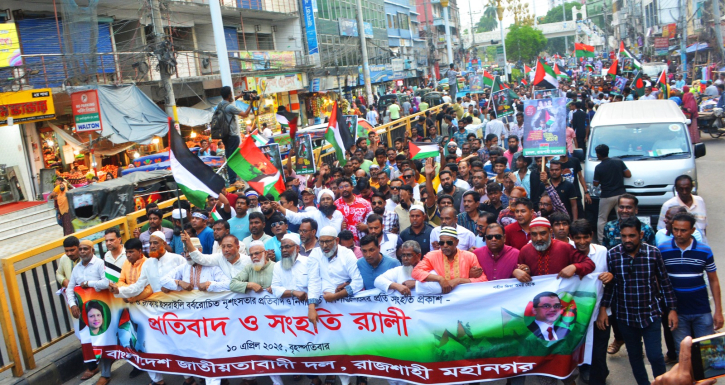 নিজস্ব প্রতিবেদক: গাজা ও রাফায় ইসরায়েলের বর্বরোচিত নৃশংসতার প্রতিবাদ ও নির্যাতিত ফিলিস্তিনিদের প্রতি সংহতি প্রকাশ করে বৃহস্পতিবার বিকেলে রাজশাহী মহানগর বিএনপি’র আয়োজনে প্রতিবাদ ও সংহতি র্যালি অনুষ্ঠিত হয়। এ লক্ষে বিএনপি, অঙ্গ ও সহযোগি সংগঠনের নেতাকর্মীরা মিছিল নিয়ে মহানগরীর বাটার মোড়ে সমবেত হয়। সেখানে সংক্ষিপ্ত বিক্ষোভ সমাবেশ অনুষ্ঠিত হয়। র্যালি ও সমাবেশে প্রধান অতিথি হিসেবে উপস্থিত ছিলেন বিএনপি জাতীয় নির্বাহী কমিটির রাজশাহী বিভাগীয় সাংগঠনিক সম্পাদক সৈয়দ শাহীন শওকত।